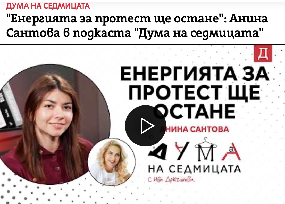 Интервю за Дневник на Ива Дойчинова с Анина Сантова, автор на бюлетина "Софийски репортер". Темите включват проблемите на столицата и начините за тяхното решаване, за най-активните общински съветници в Столичния общински съвет и за онези, които предлагат най-важните решения. Според Анина Сантова енергията за протест ще остане и ако се наложи младите отново ще излязат навън, за да изразят недоволството си от случващото се в страната